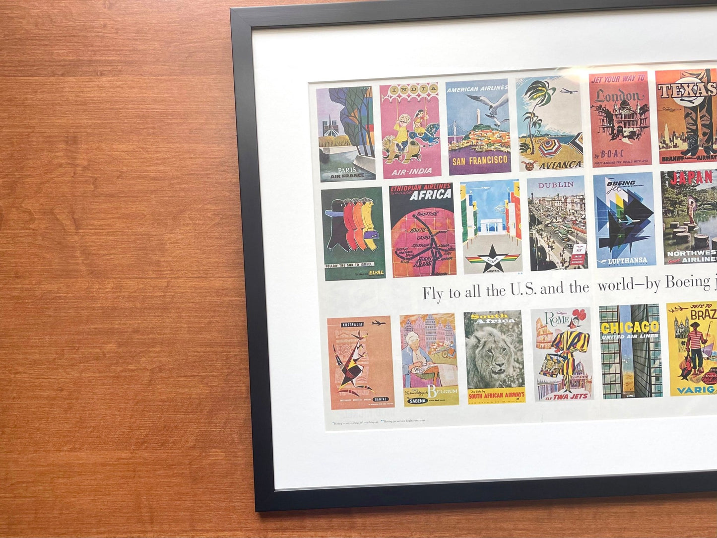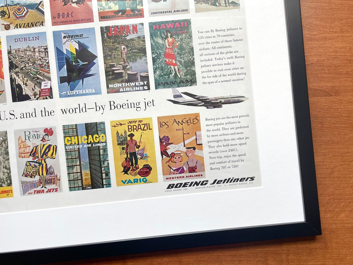 1961 Boeing Jetliners with 22 Vintage Travel Posters Advertisement in Black Wood Frame