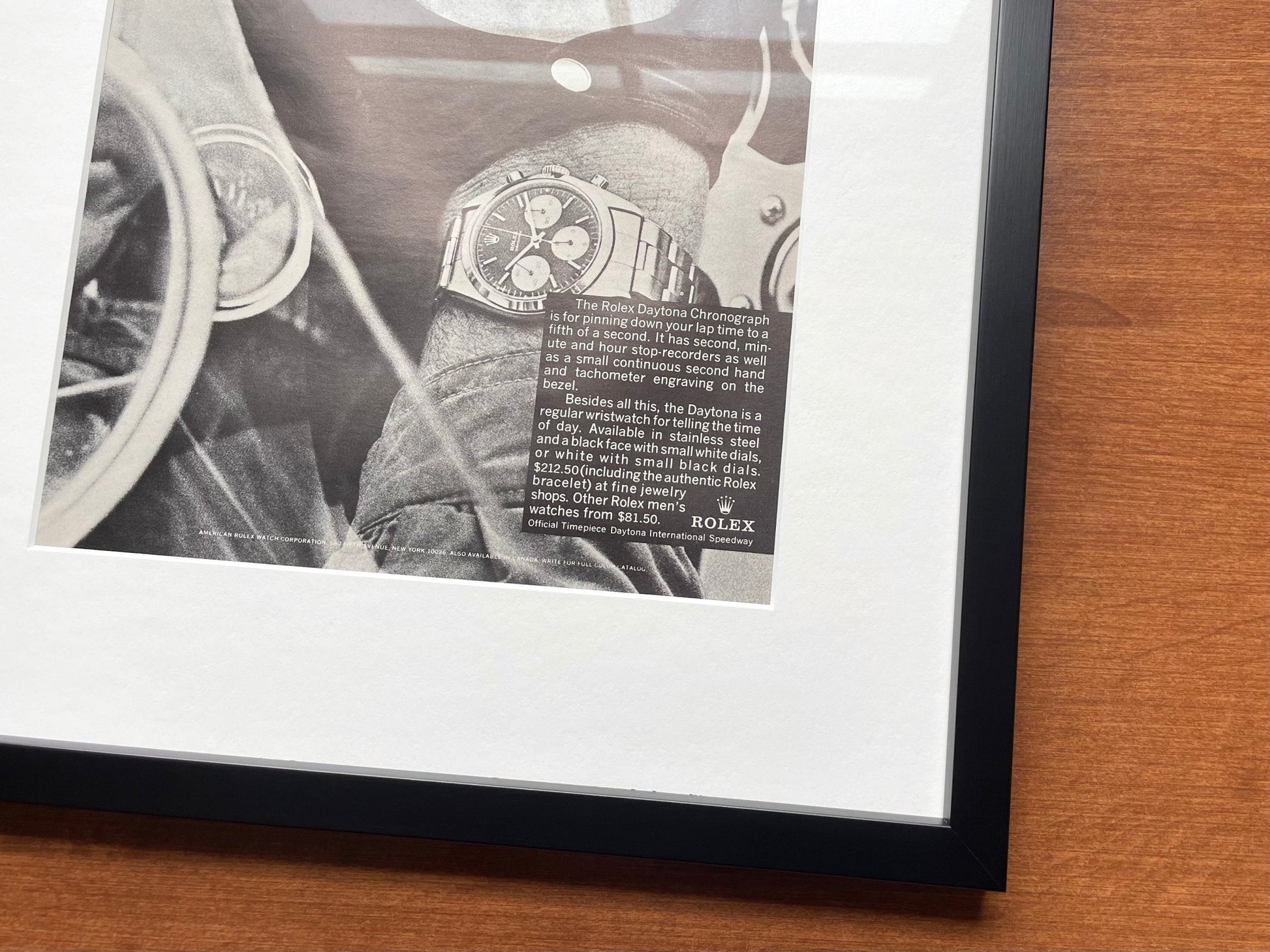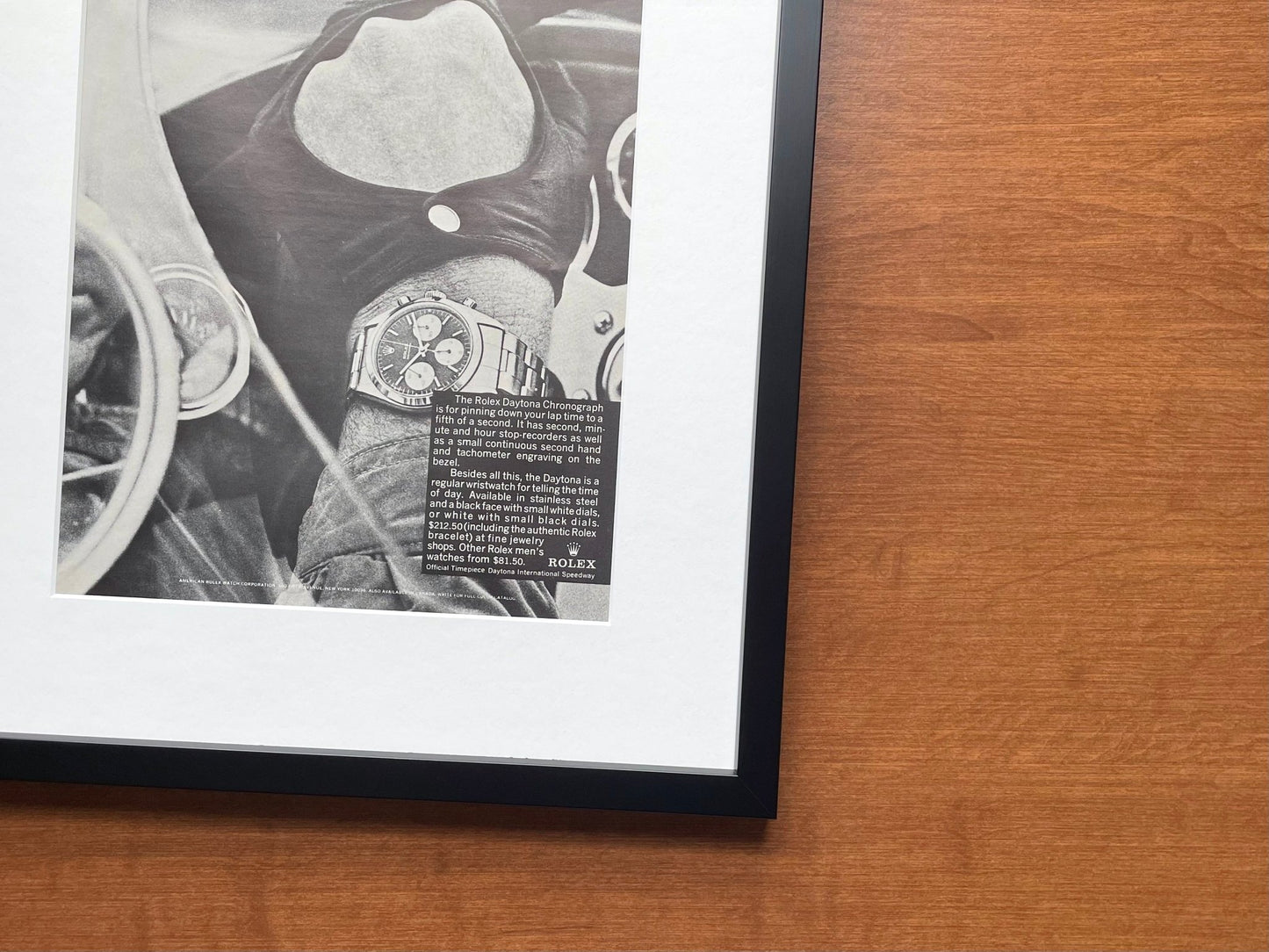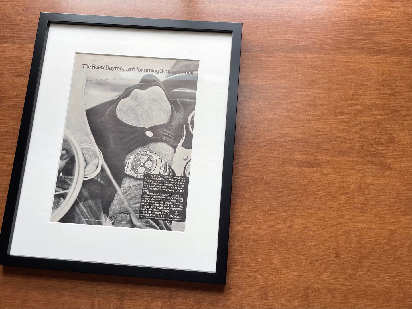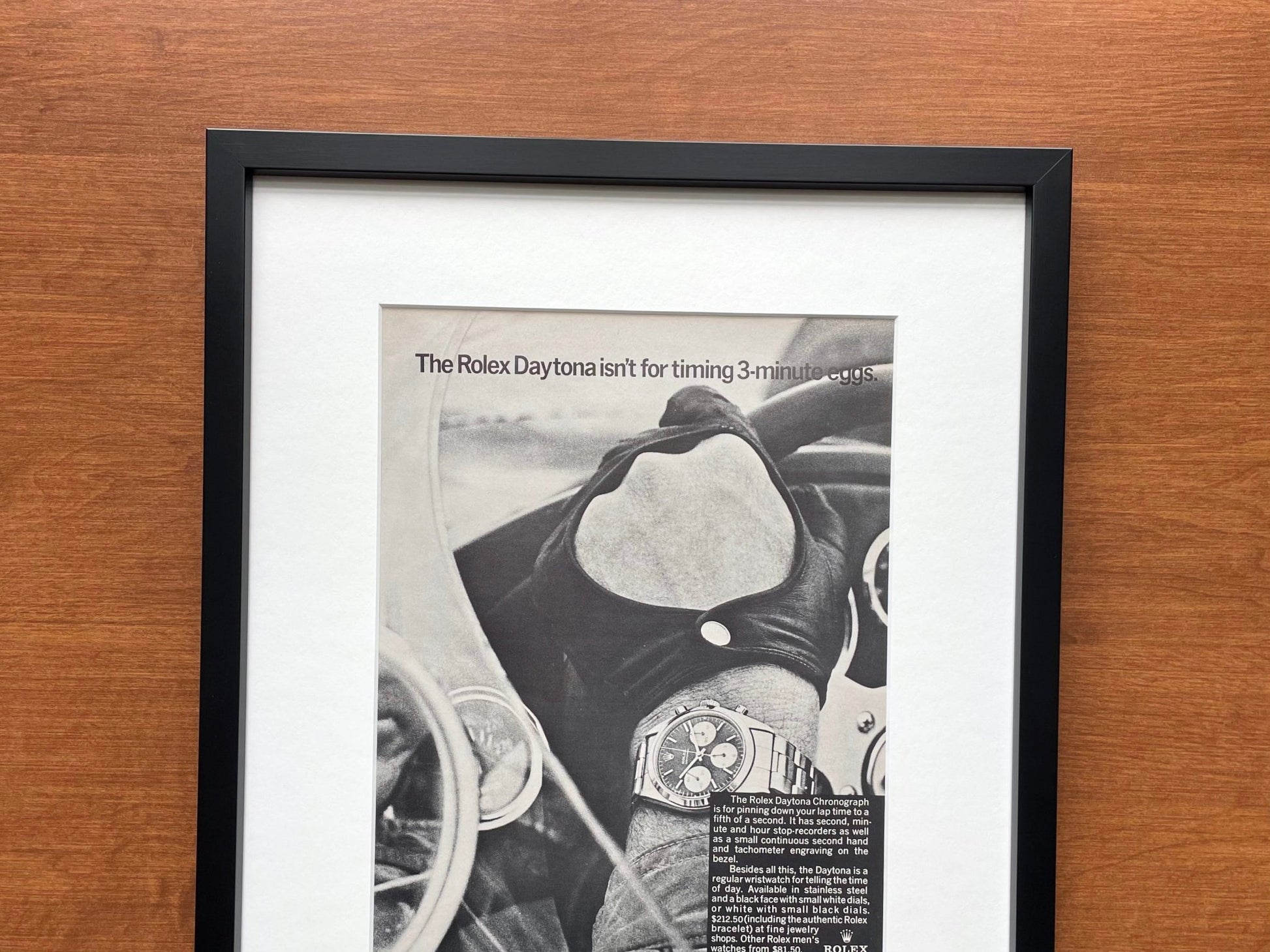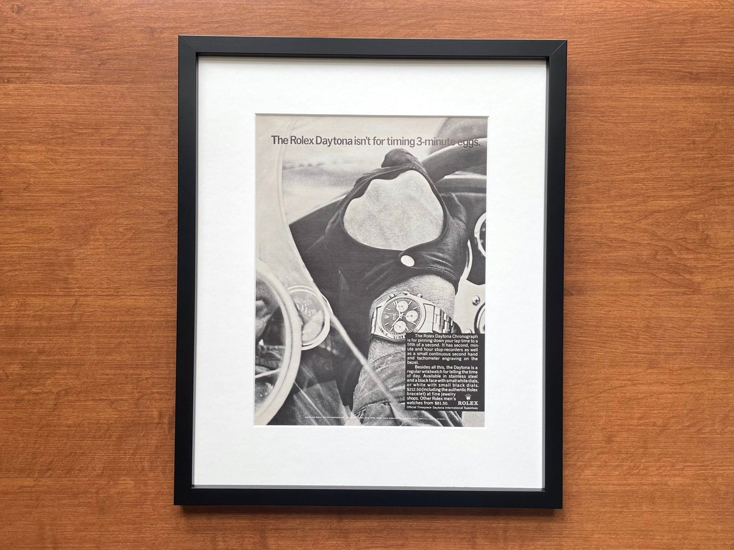 1967 Rolex Daytona "isn't for timing 3-minute eggs." Advertisement in Black Wood Frame